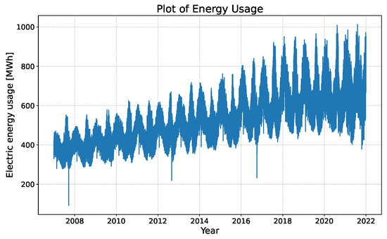 Table 1 presents the input variables used for energy prediction, selected based on their relevance to energy consumption. Meteorological data use data from the same period in which energy data are collected and represent synoptic-scale weather data for the area where energy data are utilized. Synoptic meteorological observations involve collecting weather data simultaneously at multiple observation stations at specified times. The collected variables include temperature, wind speed, wind direction, humidity, dew-point temperature, local atmospheric pressure, sunshine duration, solar radiation, visibility, and ground temperature. Additionally, time factors such as year, month, day, and hour are utilized as variables based on the collected time information. Period-specific issues, such as the influence of extended periods like COVID-19 and holidays identified in time data, are considered social factors. The collected data are prepared to align with the temporal flow, combining data from the same periods into a single dataset. To merge into one dataset, the time intervals of the data need to be synchronized.