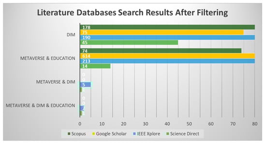 For the literature search, three key phrases were identified based on the previously set research objectives: “metaverse”, “education”, and “decentralized identity management”. The search strategy involved querying these keywords individually, in pairs, and then collectively to ensure comprehensive coverage of relevant literature. The specific combinations were as follows: