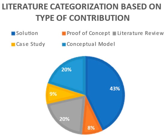 Table 3 and Figure 5 classify the referenced literature into five categories, depending on the type of contribution the authors have provided. The category with the most contributions is the “Solution” presentation, which is a result of a double-sided interpretation. On the one hand, the fact that both academia and industry are putting effort into finding innovative solutions on the topics of “Metaverse—Education” and “Metaverse—Identity Management” is crucial and most beneficial. However, on the other hand, many of these solutions are not applicable on a wider scale, as they are use-case specific, making it difficult for others to fully adopt the solution described. Modifications of each solution are needed in the best of cases for integration with interdisciplinary use cases.