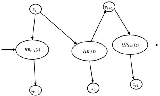 State Transition: The state transition probability describes how the system evolves from one state to another over time. In the context of heart rate prediction, it captures how heart rate changes in response to variations in exercise intensity and duration. Figure 3 illustrates a graphical representation of our DBN model for heart rate prediction based on exercise workout intensity, where represents variables influencing heart rate and represents heart rate frequencies at time t. In our study, the state transition is modeled using the following equation: