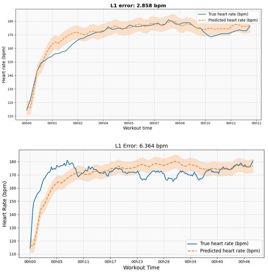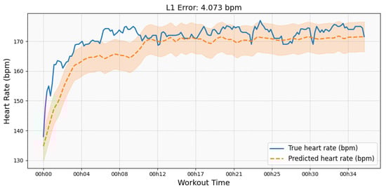 Figure 6 illustrates the model’s performance in predicting heart rate during workout sessions. The x-axis represents the time from the start of the workout session, while the y-axis shows the instantaneous heart rate in beats per minute (BPM). The solid blue line indicates the actual heart rate measured during the workout, and the dashed orange line represents the predicted heart rates generated by the model. The shaded region around the predicted values represents uncertainty bands of ±5 BPM, accounting for variability in heart rate measurements.
