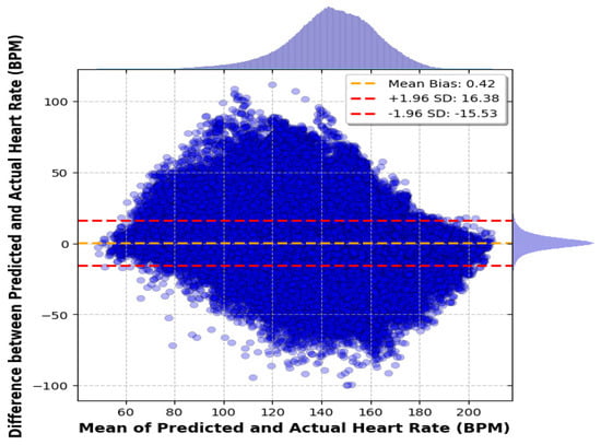 Figure 7 shows the difference between the predicted and actual heart rates across all workout sessions, plotted against the average of those heart rates. The plot has a mean bias of 0.42 BPM, indicating that, on average, the model slightly overestimates heart rates. The limits of agreement, set at ±1.96 times the standard deviation from the mean bias, range from −15.53 BPM to 16.38 BPM. These relatively tight limits suggest that most predictions are close to the actual heart rates, highlighting the model’s accuracy across various heart rate ranges. The points on the plot are evenly distributed around the mean bias line, with no clear patterns or systematic errors, indicating that the errors are random and not biased toward any particular heart rate level. The narrow range of the limits further supports the notion that our DBN model provides reliable heart rate predictions with minimal error. Such consistent performance is critical in real-world applications, where accurate heart rate monitoring is essential for making personalized fitness recommendations.