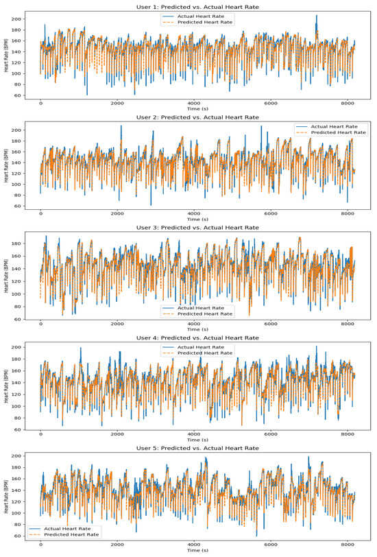 Figure 9 illustrates the model’s ability to predict heart rate evolution across different individuals during workout sessions. The solid blue lines represent the actual heart rate evolution, while the dashed orange lines depict the model’s predictions. Across all individuals, the model closely follows the heart rate trends, demonstrating its capacity to generalize well across varying users and workout intensities. The model accurately predicts heart rate responses to different exercise intensities, capturing rapid increases during high-intensity intervals and smooth declines during recovery periods. For most individuals, the predicted heart rate closely aligns with the actual heart rate, particularly during steady-state phases of the workout. However, minor discrepancies can be seen during rapid heart rate fluctuations, which may be attributed to physiological differences between individuals or noise in the sensor data. Overall, the model’s performance across multiple individuals highlights its robustness in handling varying user profiles and workout conditions, making it effective for personalized heart rate prediction and health tracking applications, as well as for delivering personalized fitness recommendations in real-world scenario.