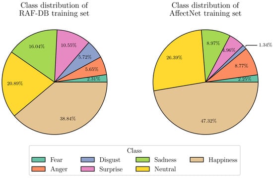 However, a significant limitation of existing methods is that they do not account for the impact of class imbalance on the effectiveness of joint training. Our exploratory experiments found that increasing the numbers of samples from different classes may exert a distinct influence in the training of an FER network; e.g., increasing the number of tail class samples has a more substantial effect on improving model performance than increasing the number of head class samples. Figure 1 shows the class distribution in the training sets of two commonly used FER datasets, RAF-DB [9,10] and AffectNet [11] (7-class). As illustrated in Figure 1, the samples of fear, anger, disgust, and surprise are only a very small proportion in both datasets, collectively accounting for less than one fourth of the total samples. In this paper, we consider these four expression classes as tail classes, while the remaining three expressions—sadness, neutrality, and happiness—are treated as head classes.