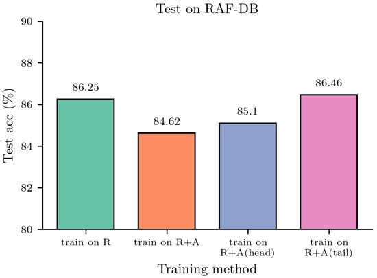 The performance of classification on the RAF-DB test set with different training sets. A denotes a training set of AffectNet while R denotes a training set of RAF-DB. head denotes head classes (sadness, neutral and happiness), tail denotes tail classes (fear, anger, disgust and surprise).