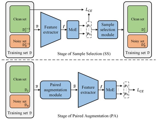 After the SS stage, a fixed clean set and a fixed noisy set are obtained, which are complementary and will be used for training in the following PA stage. In this stage, the PAM is employed to perform paired augmentation on each minibatch sampled from , yielding a class-balanced . The classification loss for all samples in is calculated to update the model parameters.