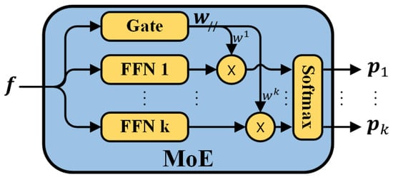 Given an input feature vector , the MoE module first processes this input with the gating mechanism. The gate determines the relevance of each expert to the given input by computing a set of importance weights. Specifically, the gate assigns a weight to each of the k experts, indicating how much each expert contributes to the final output. The outputs of these experts will be multiplied by their corresponding computed weights.