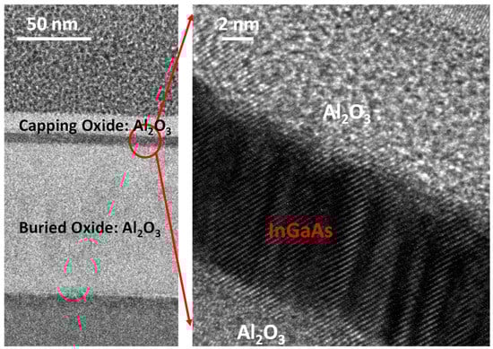 For the ultrathin InGaAs film preparation, an InGaAs film of 8 nm was firstly grown on a temporary substrate of InP via metal–organic vapor phase epitaxy, where the doping concentration of the InGaAs was controlled at ~1016 cm−3, while the In-to-Ga ratio was 53:47. An N-type Ge wafer with a resistivity of 10 ohm·cm was used as the target substrate. The InGaAs and Ge wafers were ultrasonically cleaned using an acetone solution to remove particles on the surface for 1 min. After rinsing in deionized water, both wafers were soaked in a diluted HCI solution of 10% for 30 s. The two wafers were finally rinsed in deionized water before the 50 nm Al2O3 deposition in atomic layer deposition (ALD). Subsequently, a direct wafer bonding technique was carried out to bond the InGaAs/InP wafer and Ge wafer together in air. After the post-annealing of 30 min at 300 °C in a vacuum and InP removal in a HCl solution, high-quality InGaAs-OI wafers were ultimately produced. The cross-sectional transmission electron microscope image of an 8 nm thick InGaAs-OI substrate is shown in Figure 1.