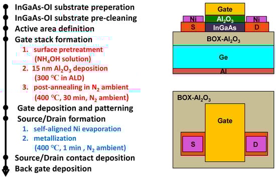 The gate-first process was utilized for the fabrication of UTB InGaAs-OI nMOSFETs, as presented in Figure 2. Firstly, the InGaAs-OI substrate was etched by a H3PO4:H2O2:H2O solution to define the active areas of the nMOSFET. To fabricate the gate stacks, a NH4OH solution and deionized water were employed to clean the InGaAs surface, where 15 nm Al2O3 was then deposited as the gate oxide in an ALD chamber at 300 °C using precursors of trimethylaluminum (TMA) and H2O. Thereafter, post-deposition annealing at 400 °C for 30 min in a N2 ambient was conducted [,]. Subsequently, tungsten was sputtered and patterned by a diluted H2O2 solution to form the gate electrode. The source and drain were fabricated by the self-aligned process of Ni evaporation and Ni-InGaAs metallization in a N2 ambient at 400 °C for 1 min []. A subsequent Ni deposition and lift-off process was performed for the contact pads. Finally, the Al contact pad was thermally evaporated as the bottom gate. The buried oxide (BOX) thickness was 100 nm in InGaAs-OI nMOSFETs, which resulted from the DWB technique where the oxides from the two wafers were bonded.