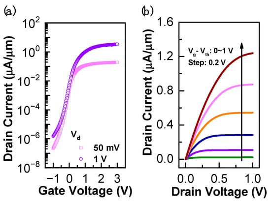 Figure 3 presents the transfer and output characteristics of the 8 nm thick InGaAs-OI nMOSFETs with no bottom gate bias, where the channel width (W) and length (L) are 20 μm and 100 μm, respectively. It could be observed that the InGaAs-OI nMOSFET channel has an off-state leakage current below 10−6 μA/μm, while the on-state current could reach 3.38 μA/μm with a drain voltage (Vd) of 1 V. This contributes to an on-to-off ratio over 3 × 106, verifying the excellent gate control in the InGaAs-OI nMOSFETs. The corresponding maximum transconductance (gm) and subthreshold swing (SS) were calculated to be 0.1675 μS/μm and 138 mV/dec, respectively. The excellent gate controllability was also validated by the output current, where the channel current increases evidently with the gate bias and remains nearly consistent in the saturation region with a minor drain-induced barrier lowering effect.