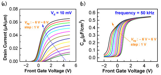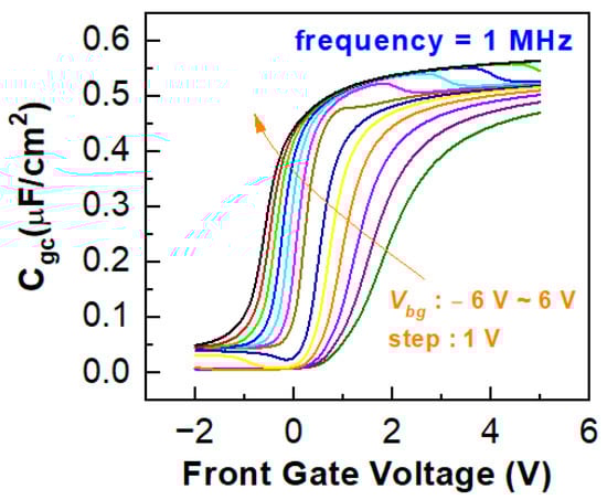 Moreover, in this InGaAs-OI structure with a UTB InGaAs film, it could be expected that the bottom gate bias would introduce an extra electric field perpendicular to the carrier transport direction. This vertical electric field could induce carrier spilling or tunneling from the channel into the InGaAs/Al2O3 interface or the dielectric, which could then lead to gate stability problems [,]. Therefore, additional evaluations are needed on the influence of gate bias with the dual-gate configuration introduced in this work. As presented in Figure 7, a specific kink effect could be observed in the high-frequency (1 MHz) C-V measurements, which reveals the existence of the electron trapping process that could form an equivalent negative floating gate and lower the capacitance value. That is, with front gate bias increasing positively, the electron trapping could occur and cause the abrupt drop in capacitance as a result of the diminished inversion channel thickness. Then, with the increase in bottom gate bias in the positive direction, the kink position shifts to the right and becomes nearly eliminated at a bottom bias of 5 V. This should be attributed to the alleviation of the orthogonal electric field with the similar bias at the two opposite gate terminals, where then the electron trapping process, as assisted by the increasing front gate, bias is mitigated. Correspondingly, a moderate bottom gate bias should be chosen in consideration of the front gate bias, where two similar positive bias voltages are generally preferred. Therefore, considering that enough positive front gate bias is usually needed to guarantee the inversion and thus the turning of the channel, the introduction of a positive bottom gate bias, e.g., 5 V, would simultaneously benefit channel mobility and gate stability.