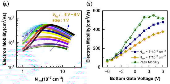 where Vfg is the front gate voltage, Vbg is the bottom gate voltage, Cgc is the capacitance of gate to channel, and μ is the carrier mobility. The corresponding electron mobility results as calculated at different bottom gate biases are presented in Figure 5a. With the application of a positive bottom gate bias, the electron mobility was thoroughly enhanced, especially at higher Ninv. To give a direct comparison of the mobility characteristics without carrier concentration influence, the channel mobility values at the same carrier concentration were extracted and are presented in Figure 5b, where promotions on the channel mobility from the bottom gate can be directly observed.