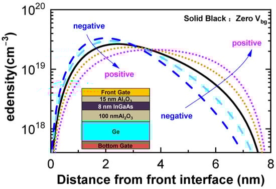 For the analysis of the underlying mechanism of the electron mobility elevation, Sentaurus TCAD simulations were conducted for the numerical calculation of the electron distribution in the 8 nm thick InGaAs channel [,]. The InGaAs-OI structure is shown in Figure 6, with the 8 nm thick InGaAs of 1016 cm−3 and 100 nm thick Al2O3 as the buried oxide and Ge substrate of 1017 cm−3. Fifteen nanometers of Al2O3 was deposited on the InGaAs film as the front gate oxide. Front gate bias and back gate bias were employed by metal gates. Figure 6 gives the simulation results at different bottom gate biases with the same Ninv of 1 × 1013 cm−2. It could be observed that, with the bottom gate bias changing from negative to positive, electrons in the InGaAs thin body were gradually redistributed with peak electron density moving from the InGaAs/Al2O3 interface into the InGaAs body. This redistribution could then suppress the interface-related scattering, on the one hand and facilitate the electron drift process with an alleviated crowding effect on the other hand. That is, in comparison to the state with electrons accumulated and localized at the interface, the uniform electron distribution in the relatively thicker channel region should be more beneficial for channel mobility. Meanwhile, the uniform distribution profile should have additional advantages in heat dissipation capability, which could then diminish the self-heating effect and also the corresponding phonon-scattering-related mobility degradations. Therefore, the relocation of the carrier wave function from the InGaAs/Al2O3 interface into the body should have contributed to the enhanced channel mobility, which also suggests a promising approach for channel mobility improvement via electron wave function modification.