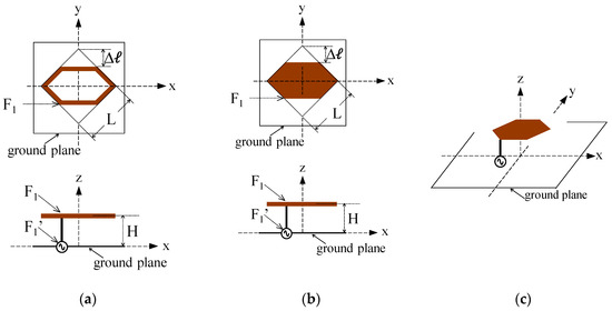 Figure 1a,b shows loop and plate antennas with one source, respectively. Each square element of side length L is at height H above the ground plane. The element has a feed point F1, and the diagonal corners are truncated with length Δ for CP radiation. We connect the element to a vertical, straight feedline F1–F′1 of length H and excite the lower end F′1 by a coaxial line. The antenna is made of wires with a radius r, and the plate is approximated using a wire grid model [10]. We analyze the antenna using our coded software based on MoM [9]. The ground plane is assumed to be infinite to an extent, so image theory is applied to the analysis. Note that our coded software assumes that current along an antenna wire flows only in the wire axis direction and expands the current with piecewise sinusoidal functions, which are also used as weighting functions.
