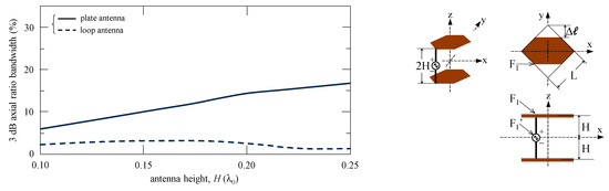 We explain why the axial ratio bandwidths of the loop and plate antennas change with antenna height H. For this, a plate antenna modeled in the analysis using image theory is shown in the insets of Figure 2, where the model is a two-element array antenna with a distance of 2H in the z-axis direction and the array distance varies in a range of 0.2λ0 ≤ 2H ≤ 0.5λ0. This fact means that the mutual coupling effects of the two elements vary with 2H, resulting in a change in the axial ratio bandwidth. From Figure 2, the plate antenna has stronger mutual coupling effects than the loop antenna, since the bandwidth of the plate antenna changes with H appreciably compared to the loop antenna’s bandwidth.