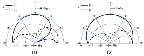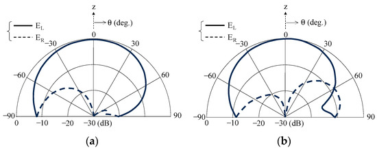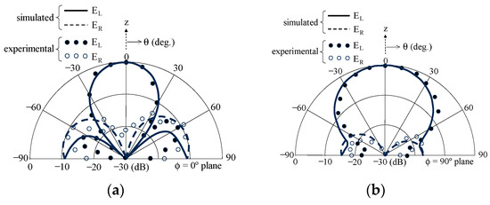 The simulated radiation patterns of the plate antenna at H = λ0/4 are shown in Figure 3. The side length and corner truncation are (L, Δ) = (0.38λ0, 0.15λ0). The radiation is decomposed into left (EL) and right-hand (ER) CP wave components. It is seen that the antenna radiates a CP beam of EL in the direction normal to the antenna plane. The half-power beam widths (HPBWs) are 79° and 117° in the ϕ = 0° and 90° planes, respectively. The gain is 5.7 dBi.