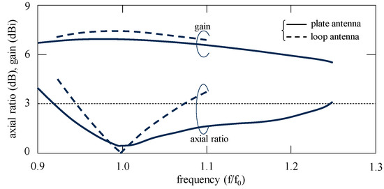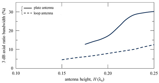 The simulated axial ratio bandwidths versus height H are shown in Figure 5. The element parameters (L, hB) are optimized for CP radiation at each height, H. With an increase in the height, the difference between the loop and plate antennas’ bandwidths becomes appreciable, as in the case of corner truncation (see Figure 2). The difference at H = λ0/4 becomes 17% (=30–13%). Note that the solid and dotted lines disappear into small values of height H, indicating that the antennas do not radiate CP waves for a 3 dB axial ratio criterion at f0. Also, note that the CP radiation of the loop antenna is attributable to quasi-two sources, which excite adjacent loop corners with the same amplitudes and a phase difference of 90°. This radiation mechanism is applicable to a square plate-loop antenna with plate width w for the reason mentioned in Section 2. Therefore, the CP radiation of the plate antenna of side length L is attributed to that of a plate-loop antenna whose width becomes w ≈ L/2.