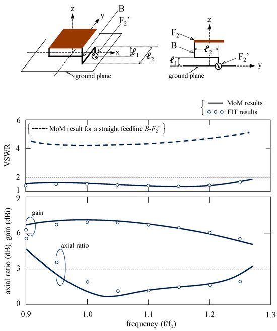 Next, we consider input impedance matching by modifying the straight feedline B–F′2 of the plate antenna into a crank one, as shown in the inset of Figure 8. The crank feedline is specified by lengths (1, 2), which are selected for VSWR < 2. Note that the other parameters are fixed at the same values as those for H = λ0/4.