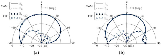 Up to this point, we have discussed the radiation characteristics using the MoM. To verify the results, we reproduce them using a finite integration technique (FIT) [11], i.e., a commercial software called CST Studio Suite. The CST results are shown with small circles and dots in Figure 8 and Figure 9, which agree with the MoM results.