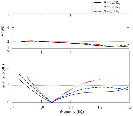 Before moving on to the next section, we refer to the VSWR and axial ratio bandwidths shown in Figure 8. It is seen that the VSWR bandwidth is large enough to include the axial ratio bandwidth at an antenna height of H = 0.25λ0. Further simulated results at heights of H < 0.25λ0 are shown in Figure 10. The VSWR bandwidth is wider than the axial ratio bandwidth at H < 0.25λ0.