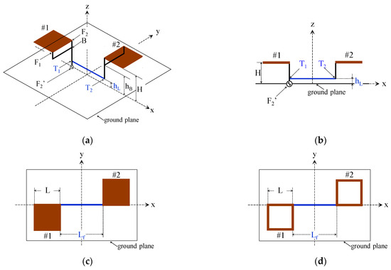 Array antennas with quasi-two sources using a horizontal, straight feedline T1–T2. (a) Perspective view of a present antenna; (b) Side view; (c) Top view of the present antenna; (d) Top view of a reference loop antenna array.