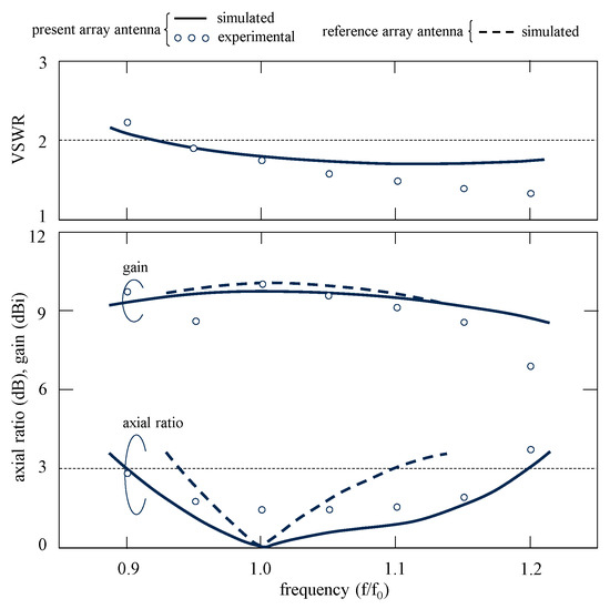 Solid and dotted lines in Figure 12 show the simulated radiation patterns for (L, hB) = (0.31λ0, 0.13λ0). It is observed that a CP radiation beam is formed in the direction normal to the antenna plane. The HPBWs are 37° and 61° in the ϕ = 0° and 90° planes, respectively. The gain is evaluated to be 9.7 dBi. The simulated gain, axial ratio, and VSWR versus frequency are shown with solid lines in Figure 13. Dotted lines show the simulated results of a reference array antenna composed of loop elements with quasi-two sources [see Figure 11d], having parameters of (L, hB) = (0.26λ0, 0.14λ0). It is found that the present antenna has an axial ratio bandwidth of 28%, which is twice as wide as that of the reference antenna (15%). The gain and VSWR of the present antenna are more than 8.7 dBi and less than 2.1 in the axial ratio bandwidth. Note that an overlap bandwidth for VSWR < 2 and axial ratio < 3 dB is 26%, and the VSWR is calculated concerning a 75 Ω coaxial cable since the VSWRs for a 50 Ω coaxial line are less than three in the CP wave bandwidth. Also, note that the horizontal feedline T1–T2 has a characteristic impedance of Z0 = 125 Ω, the same as that of the crank feedline mentioned in Section 3.