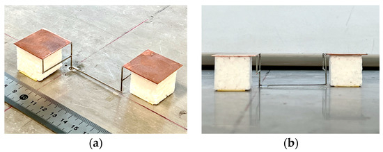 The abovementioned results of the present antenna are verified with experimental results using a prototype made at f0 = 3 GHz; its photographs are shown in Figure 14. The experimental results are shown with dots and small circles in Figure 12 and Figure 13. Agreement is observed between the experimental and simulated results.