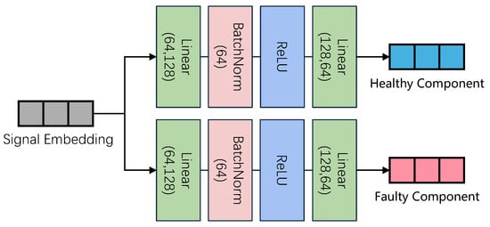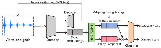 where and are hidden representations of healthy and faulty components, and H is the hidden representation of the input vibration signal. During the training phase, we train the decoupler to divide the signal embedding into healthy and faulty components. For normal-condition signals, the faulty component decomposed by the decoupler should approach zero. For faulty signals, the decoupler will decompose it into corresponding healthy and faulty components. In the testing phase, when we adapt our model with normal-condition signals, the decoupler learns the distribution of healthy components. Therefore, when facing the tested faulty signal, the decoupler will adaptively extract the healthy component and the faulty component. This way, our decoupler can separate the two components from the embedded signal during testing.