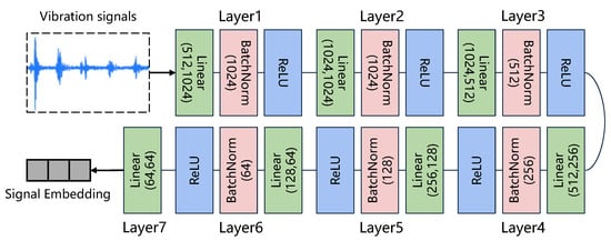 The encoder is designed to embed vibration signals into a low-dimensional latent space . Without loss of generality, we utilize a Multilayer Perceptron (MLP) as the encoder. As illustrated in Figure 2, the encoder consists of seven layers. In the first six layers, each layer is composed of a linear layer, a normalization layer, and an activation function, which can be formulated as follows:
