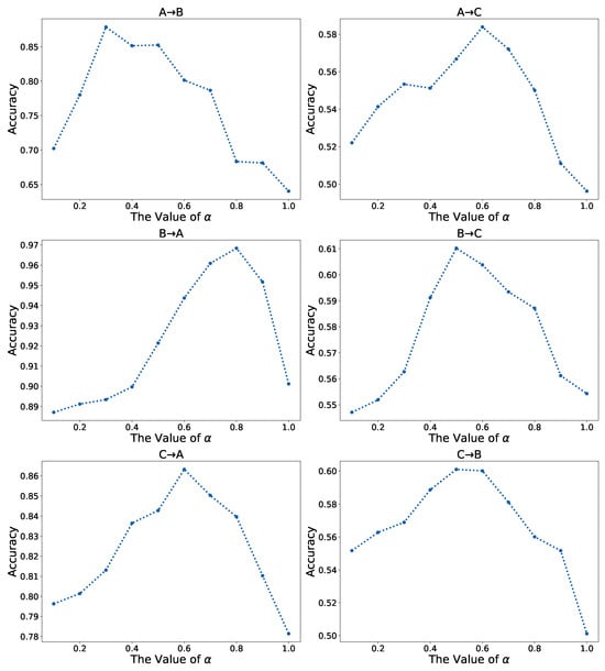 As shown in Figure 5, we analyze the training loss weight for test performance. This hyperparameter controls the impact of reconstruction loss, varying from 0 to 1 with a step size of 0.1 on three datasets. The experimental results indicate that selecting an appropriate weight (ranging from 0.3 to 0.6) enhances diagnostic accuracy in TTA settings across all datasets. For instance, in the cases of A→B and A→C, the models achieve optimal results with an accuracy around 0.87 at = 0.3 and 0.59 at = 0.6, respectively. We attribute the performance improvements to high-quality signal embeddings. This is because the encoder–decoder paradigm reconstructs the signal in a self-supervised manner, which can generate informative and denoised signal embeddings.