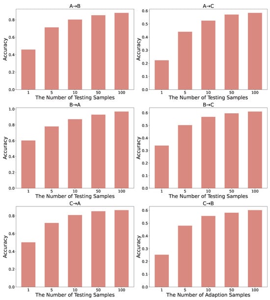 We also analyze the impact of test sample size on accuracy, as shown in Figure 6. We vary the number of testing samples (1, 5, 10, 50, and 100) and observe the influence on the model’s adaptation performance across the three datasets. Each sub-figure represents a case of test-time adaptation, corresponding to different combinations of source (Dataset A, B, C) and target (Dataset A, B, C) domains.