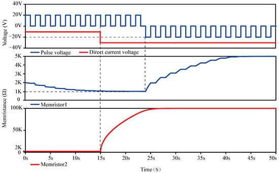 The memristance is reduced if the positive voltage applied to the memristor is greater than . The memristance is increased if the negative voltage applied to the memristor is lesser than . The greater the positive voltage, the slower increases, and the slower the memristance decreases. Figure 1 shows the curves of the memristance when these memristors are applied by different voltages. The pulse voltage and direct current voltage are designed to study the memristance change characteristics of Memristor 1 and Memristor 2, respectively. All the simulation processes in this paper are implemented by Cadence.