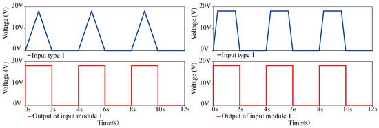 The initial memristance of is . If , the memristance of decreases to . If , the memristance of increases to . If , , and are constructed as a simple comparator. outputs when the non-inverting input voltage of is greater than the inverting input voltage of . can reduce signal distortion during transmission by providing low output impedance. It improves the waveform of the signal and maintains signal integrity. The initial memristance of is . The connection mode of is a reverse connection. When the applied voltage is greater than in , the memristance of increases from to in a short time. The voltage of is limited to a meager value. It can prevent excessive input voltage from damaging the circuit in this paper. The simulation results of the input module are shown in Figure 3. Input types 1 and 2 are triangle and trapezoid signals, respectively. Triangle and trapezoid signals become regular pulse signals after the filtration of the input module.