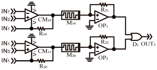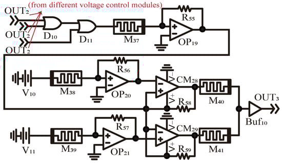 The circuit of the voltage control module is shown in Figure 4. The voltage control module in the circuit reflects the principle of classification. The voltage control module is designed for classification based on the loser-take-all mechanism. Three input signals are randomly assigned together for classification. – are randomly assigned to three groups. Voltage control Modules 1–9 are designed for primary classification by the loser-take-all mechanism. The output signals of primary classification are subjected to secondary classification. , and are inputs. is an OR gate. and are voltage comparators. is the output voltage of the voltage control module. The memristance of and is regulated by the output voltage of and , respectively. The ports of in and are connected to ground. The ports of in and are connected to . outputs the voltage of when the inverting port voltage exceeds the non-inverting port voltage. On the contrary, outputs 0 V. The principle of is the same as . The mathematical formula of is as follows: