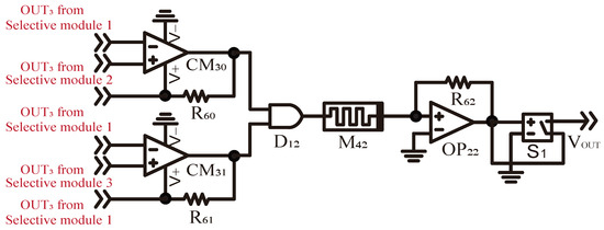 The selective module is shown in Figure 5. and are OR gates. – are precision operational amplifiers. and are voltage comparators. is a buffer. is the output voltage of the voltage control module. is the output voltage of the selective module. , and are implemented as a basic amplifier. The mathematical formula is . The mathematical formula of is . The mathematical formula of is . outputs when . outputs when . The mathematical formula of is