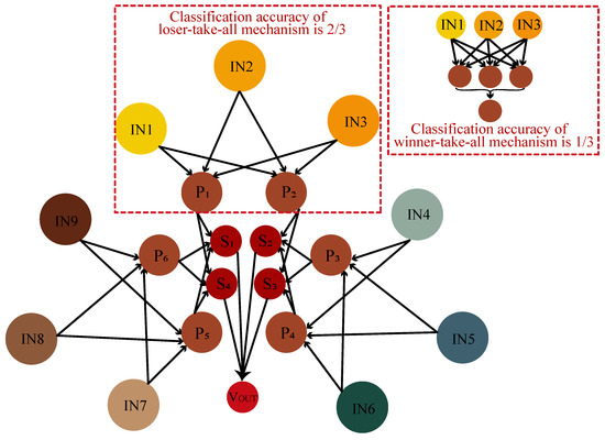For a typical loser-take-all mechanism, the neurons in the network are interconnected and receive inputs from various sources. These inputs are processed, and the neuron with the lowest output is the “loser”. The network’s response is sparsified, meaning that only a small subset of neurons is activated. As shown in Figure 7, the memristor-based classification circuit with the loser-take-all mechanism in this paper contains nine inputs. – are randomly divided into three groups. The loser-take-all mechanism means that the output signal occurs only when the corresponding input does not have the greatest value among all inputs. For three inputs, the random guessing of which class an input belongs to has an accuracy probability of only 1/3. In contrast, the random guessing of which class it does not belong to has an accuracy probability of 2/3. The loser-take-all mechanism improves classification accuracy by identifying which category the input does not belong to. In the primary classification, – are classified out by the loser-take-all mechanism. – do not belong to the greatest class in –. In the secondary classification, – are classified by the loser-take-all mechanism. – do not belong to the greatest class in –. is the final output in –.