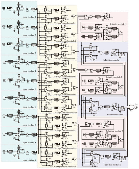 The inhibition module is shown in Figure 6. The inhibition module in the circuit can inhibit the input signals by the loser-take-all mechanism. Relatively large input signals are inhibited, and the smallest input signals are the final output. Input signals in the inhibition module are from different selective modules. and are voltage comparators. is an AND gate. is a precision operational amplifier. is a voltage-controlled switch. The inverting input of the voltage-controlled switch is grounded. , and are implemented as a basic amplifier. The mathematical formula is . The mathematical formula of is