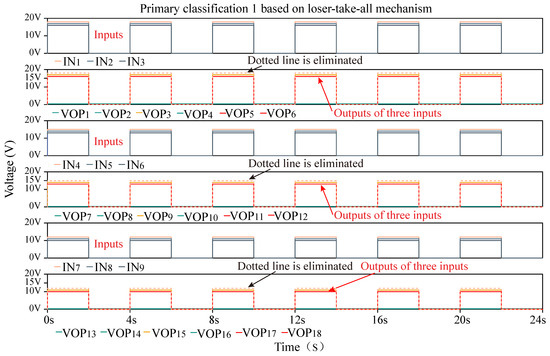 The simulation results illustrate the application of the loser-take-all mechanism in this circuit. The smallest part can be activated in primary classification and secondary classification. In this circuit, – undergo two rounds of classification. One of the nine inputs is ultimately activated based on the loser-take-all mechanism.