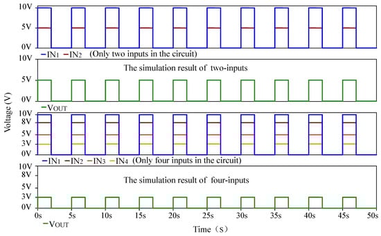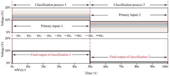 The memristor-based classification circuit with the loser-take-all mechanism is simulated with Cadence 17.2. As shown in Figure 9, – are nine inputs in the circuit. , and generate voltages of 18 V, 17 V and 16 V, respectively. , and generate voltages of 15 V, 14 V and 13 V, respectively. , and generate voltages of 12 V, 11 V and 10 V, respectively. The width of each pulse is 2 s, and the period is 4 s. – are the results of the primary classification in , and . , and output the voltage of 0 V. outputs the input voltage of . and output the input voltage of . is eliminated in the primary classification. – are the results of the primary classification in , and . , and output the voltage of 0 V. outputs the input voltage of . and output the input voltage of . is eliminated in the primary classification. – are the results of the primary classification in , and . , and output the voltage of 0 V. outputs the input voltage of . and output the input voltage of . is eliminated in the primary classification. The greatest values of the corresponding inputs are eliminated by the memristor-based classification circuit with the loser-take-all mechanism. At last, , , , , and are outputs of the primary classification. The simulation results of two inputs and four inputs are shown in Figure 10. and are the two inputs in the two-input simulation. and generate voltages of 10 V and 5 V, respectively. The width of each pulse is 2 s and the period is 5 s. The voltage of 5 V is the output based on the loser-take-all mechanism in the two-input simulation result. – are the four inputs in the four-input simulation. , , and generate voltages of 10 V, 8 V, 5 V and 3 V, respectively. The voltage of 3 V is the output based on the loser-take-all mechanism in the four-input simulation result. As shown in Figure 11, – are different inputs in the circuit. Classification Process 1 occurs from 0 s to 50 s. – represent different voltage levels and perform Primary Classification 1 in the initial classification. In Classification Process 1, – are 18 V-10 V, respectively. The nine inputs are classified into six outputs after Primary Classification 1. The six inputs are classified into the single output after Scondary Classification 1. outputs the voltage of 10 V. Classification Process 2 occurs from 50 s to 100 s. In Classification Process 2, – are 1 V-9 V, respectively. outputs the voltage of 1 V.