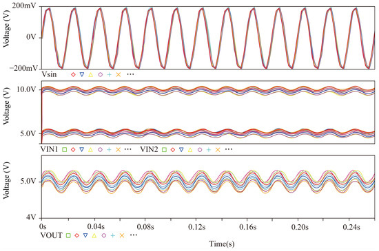 Figure 12 is the Monte Carlo analysis simulation results of inputs and outputs. The tolerance value of the resistance setting is , and the simulation times are 50. Vsin is the additional sinusoidal interference signal. The DC bias voltage of the sinusoidal interference signal is 0 V, and the AC amplitude is 0.2 V. The frequency of the sinusoidal interference signal is 50 Hz. The simulation results of are relatively stable and consistent across different tolerance values. The simulation results show that the circuit designed in this paper can run stably under tolerance values.