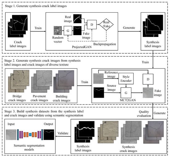 - A novel dataset augmentation framework is proposed to address the limitations of texture diversity and data availability issues in small crack datasets. The proposed framework operates in two stages: a label generator and a crack image generator. By implementing this framework to generate a diverse texture crack dataset, the segmentation accuracy in crack detection systems can be improved in environments with small amounts of available data.