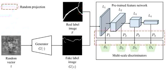 ProjectedGAN [23] is a promising candidate for implementing a label generator, as it can generate diverse images. As shown in Figure 2, ProjectedGAN consists of a generator, a pre-trained feature network, a random projection, and multiscale discriminators. The generator G produces fake labeled images from a random vector z. Features of a real label image x and a fake label image are extracted by pre-trained feature extraction networks to disentangle causal generative factors. However, according to [23], the discriminator may not fully exploit the features extracted from the feature extraction networks. In Figure 2, random projection is employed to enhance the discriminator’s capacity to fully utilize features extracted from the pre-trained networks, facilitating the mixing of features across channels and resolutions through 1 × 1 and 3 × 3 convolutions. Then, the multiscale discriminators receive the projected features as inputs and determine whether they are real or fake. These multiscale discriminators provide feedback, encouraging the generator to create finely detailed images. Finally, the generator and discriminator weights are updated based on the feedback from the discriminators. The ProjectedGAN optimization process can be expressed as follows: