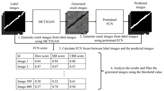 Quantifying whether the generated image represents the crack pattern in a specific label image can be used to evaluate the generator’s performance. Evaluating the generator consists of three steps: generation, prediction, and comparison. First, the generator generates a crack image from the label image, a reference image. Then, image cracks are predicted by using the FCN model. The quality of the generated images can be evaluated by comparing the predicted images with the label images of the generated crack image and calculating the Dice, Hausdorff distance (HD) [26], and crack representation balance (CRB) scores. Lastly, the evaluated images are used to augment the original dataset. The intersection over union (IoU) and Dice scores are used to evaluate the augmented crack datasets’ segmentation performance. The IoU and Dice scores are calculated as follows: