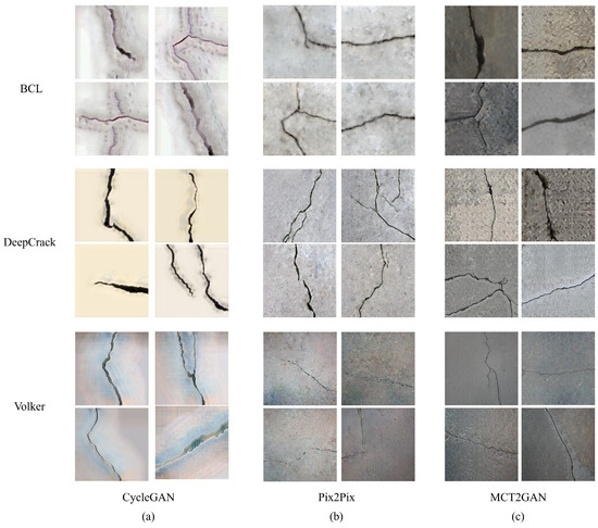 An ablation study was performed to confirm the effectiveness of the label generator in data augmentation, and the results are summarized in Table 3. According to Table 3, increasing the cycle consistency loss can improve the Dice scores by preserving the shape of the crack. The ReMix method improved the Dice scores of BCL and DeepCrack, while Volker’s performance suffered. By changing the adversarial loss from BCE to hinge loss, the variance in the Dice scores in the three datasets decreased. It was confirmed that hinge loss improves training stability by unscrewing the distribution of the three datasets. However, using hinge loss without the ReMix method decreased performance in all datasets. The model with hinge loss is typically trained to perform generalization for stable training. In environments with small amounts of data, hinge loss can lead to overfitting issues. ReMix, on the other hand, is a method that enhances the diversity of data based on augmentation techniques, thereby preventing overfitting. Therefore, upon integrating the ReMix method and hinge loss, they may act as complementary solutions to each other’s weaknesses. In addition, a label generator can enhance the performance of MCT2GAN by increasing the amount of data.