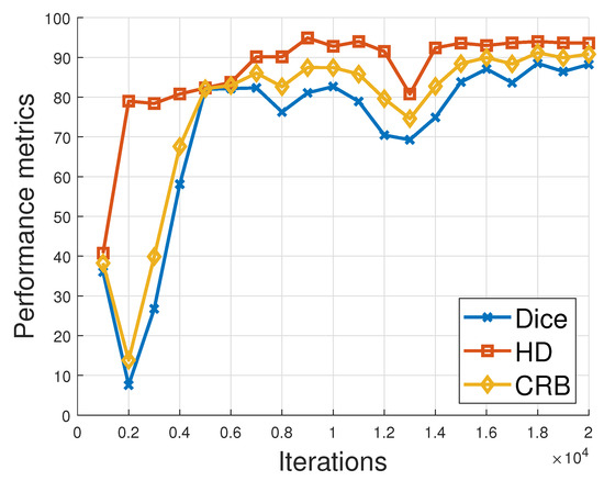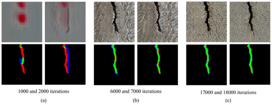The quality metrics and images generated by the crack generator are described in Figure 6 and Figure 7. After 2000 iterations, the HD score increased, indicating that the shape of the generated crack can be closer to the shape of the label image. However, both the Dice and CRB scores decreased. As shown in Figure 7a, this change was confirmed to be due to a reduction in overlapping areas between the label crack and the synthesized crack due to the crack being generated in the wrong location compared to the image in 1000 iterations. As a result, the CRB score effectively penalizes the synthesized crack’s localization error, reflecting the positional discrepancy despite the improved shape accuracy. The Dice score barely changed between 6000 and 7000 iterations, as illustrated in Figure 6, while the HD and the CRB scores increased. In the overlapped image at 6000 and 7000 iterations, as shown in Figure 7b, the region of blue color (FP) below the crack decreased from 7000. It was confirmed that the HD score penalizes this exaggerated appearance of cracks. In this case, the CRB score effectively captures this penalty, reflecting the shape correction and overall crack quality. The HD score was maintained from 17,000 to 18,000 iterations, as illustrated in Figure 6, but both the Dice and the CRB scores increased. As shown in Figure 7c, the reduction in the blue region could indicate that the size of the synthesized crack changed. Here, the CRB score captures these changes effectively, reflecting the synthesized crack’s size and shape. Consequently, the CRB score can be employed to assess the overall quality of synthesized crack images by simultaneously evaluating the images’ localization, size, and shape.