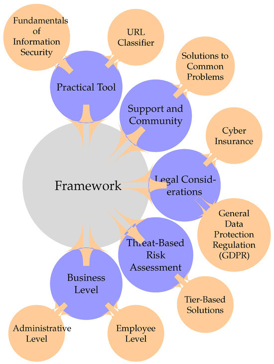 The framework aims to aid SMEs in understanding their business on multiple levels, such as identifying their assets, potential vulnerabilities, and administrative processes, and examining the employee work environment. Moreover, the framework offers tier-based solutions for phishing, malware, and web-based attacks. The legal section offers advice to firms about the General Data Protection Regulation (GDPR) and cyber insurance. Finally, the support section discusses the opportunity for firms to collaborate for common solutions. The general overview/structure for these sections can be seen in Figure 2. For the three threats, levels of security will be established, which can be applied by SMEs, depending on their resource limitations. This is a combination of both threat-based risk assessment and LCCI, incorporating two promising solutions.