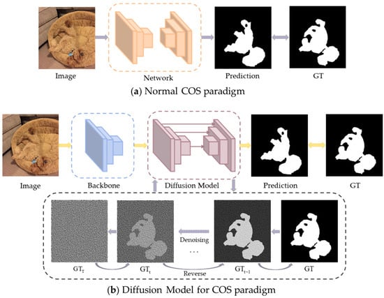 The paradigm of camouflaged object segmentation. (a) The normal COS paradigm inputs images into the network for mask prediction. (b) The diffusion model for the COS paradigm inputs images through the backbone to obtain features, and then utilizes the diffusion model to iteratively refine the noisy GT image, ultimately generating the mask prediction.