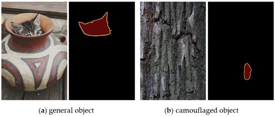 COS is a task aimed at mimicking the visual system of predators to segment objects hidden in the environment. Compared with other segmentation tasks, COS is a category-agnostic task, where a camouflaged object refers to all pixel points in the camouflaged area of an image. This task involves predicting the probability of each pixel in an image under the supervision of a binary mask, requiring the COS algorithm to assign labels to each pixel point. A label value of 0 indicates that the pixel does not belong to a camouflaged object, while a label value of 1 indicates that the pixel fully belongs to a camouflaged object [19]. This is used to determine whether each pixel belongs to a camouflaged object. Figure 2 shows the difference between camouflaged objects and ordinary objects, with camouflaged objects being more difficult to recognize compared to ordinary objects.