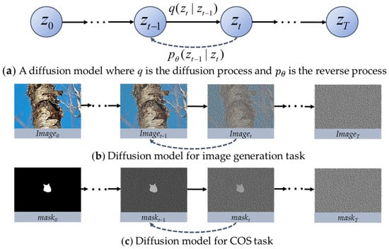 The diffusion model, originating from non-equilibrium thermodynamic theory, is a probabilistic generative model. The core idea of the diffusion model is to generate high-quality data by gradually adding noise to the data and learning to reverse this process. The working principle of the diffusion model is divided into two main stages: the forward diffusion process and the reverse diffusion process. In the forward diffusion process, the model gradually adds Gaussian noise to the data, forming a Markov chain, until the data in the image are completely covered by noise. In the reverse diffusion process, a neural network is trained to learn how to gradually denoise from noisy data and recover the original data. The diffusion model has received widespread attention for its powerful generative capabilities and ability to retain details, enabling it to demonstrate outstanding performance in various fields such as image generation, image restoration, audio generation, and style transfer. Since the introduction of the denoising diffusion probabilistic model (DDPM) in 2020 by Ho et al. [25], DDPM was the first application of the denoising diffusion probabilistic model to image generation tasks, which laid the foundation for the use of diffusion models in the field of image generation. In 2022, Wu et al. proposed MedSegDiff, the first network based on the diffusion probabilistic model (DPM) for general medical image segmentation tasks [26]. In 2023, Chen et al. introduced a diffusion model for COS named Camodiffusion, which provides a new perspective and solves many existing problems in COS tasks [27]. In the same year, by modeling the object detection task as a denoising diffusion process from noise boxes to object boxes, DiffusionDet successfully introduced the advantages of generative models into object detection [28].