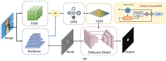 The FreDiff we propose is depicted in Figure 4a. Firstly, the image is simultaneously input into the feature extraction backbone and FAM. Then, the extracted features are fused by FF and input into the GFM to make the model focus on global information. After that, it is input into the UEM to enhance the detail information. Next, the feature information and the mask image are input into the diffusion model together. Finally, the predicted mask is generated through iterative refinement.